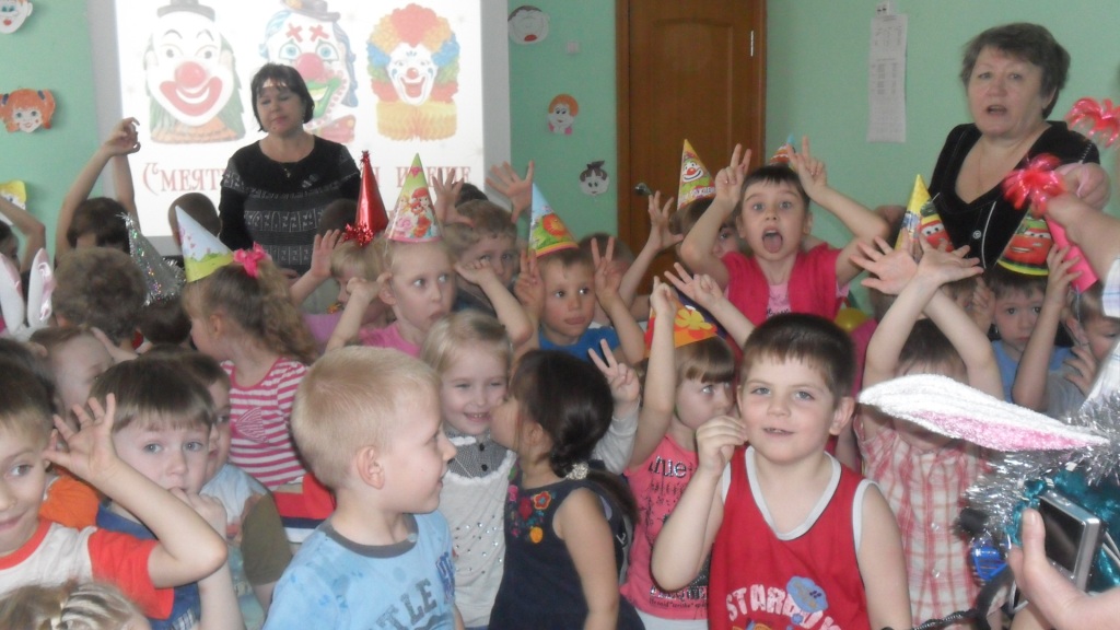 Все в этот день было необычно- дети и воспитатели в веселых колпачках, с разрисованными лицам, в зале раздавался веселый смех. Под руководством веселых клоунов Прошки (Колмакова Т.С.), и Тимошки (Алексееева Г.Н.) прошли веселые игры- эстафеты «Веселые матрешки», где игрокам надо было повязать платок на воздушный шар; «Накорми друга»- дети с завязанными глазами кормили друг друга шоколадными конфетами; «Петушиный бой»-нужно без помощи рук вытолкнуть противника из обруча; «Мыльные фантазии»-одна команда детей надували мыльные пузыри, а другая старалась все пузыри лопнуть.